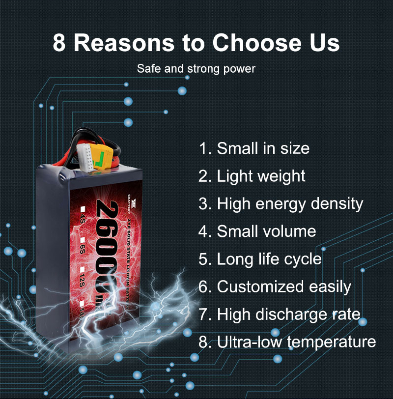Авангардна технология: Нашите батерии от твърдо състояние представляват най-новите напредвания в технологията на батерията, предлагащи превъзходна производителност и безопасност, включителноВисока енергийна плътност 22AH 20AH 22000MAH 10C 20C Твърдо състояние Li-йонна батерия за дронове на дълги разстояния.